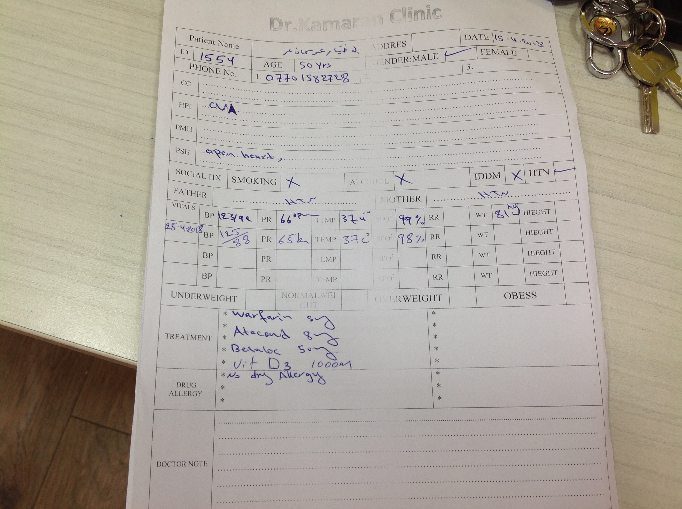 BP : 110/72 PR : 64 RR : SPO2 : 99 CC : HIGH BP